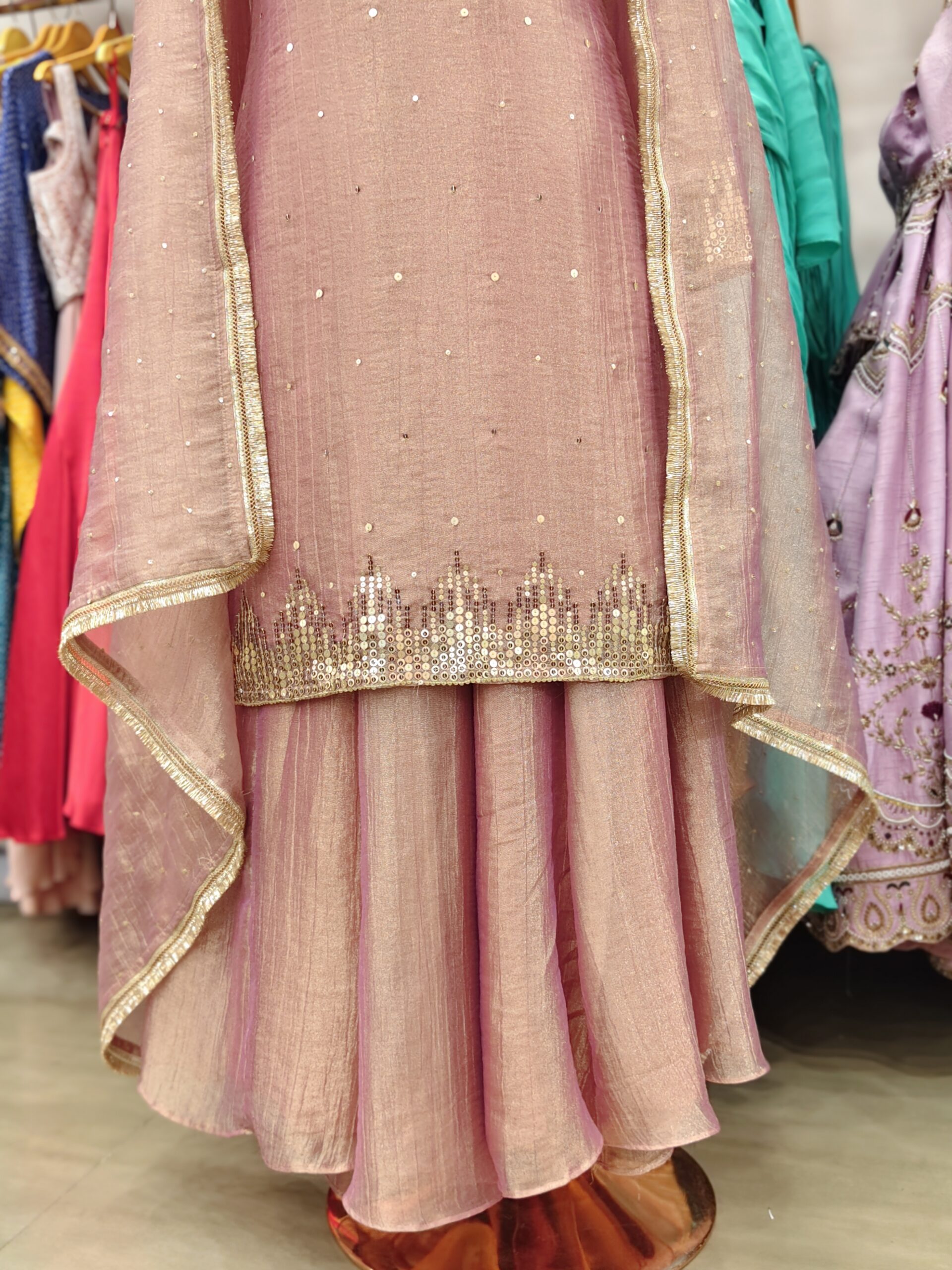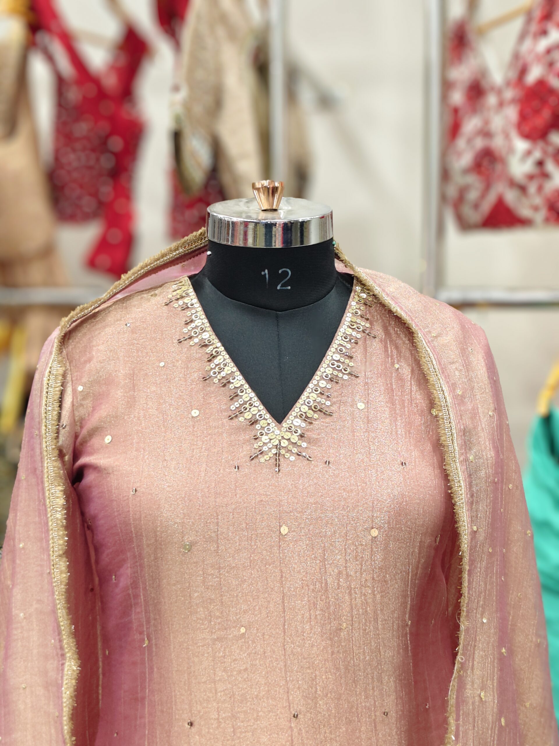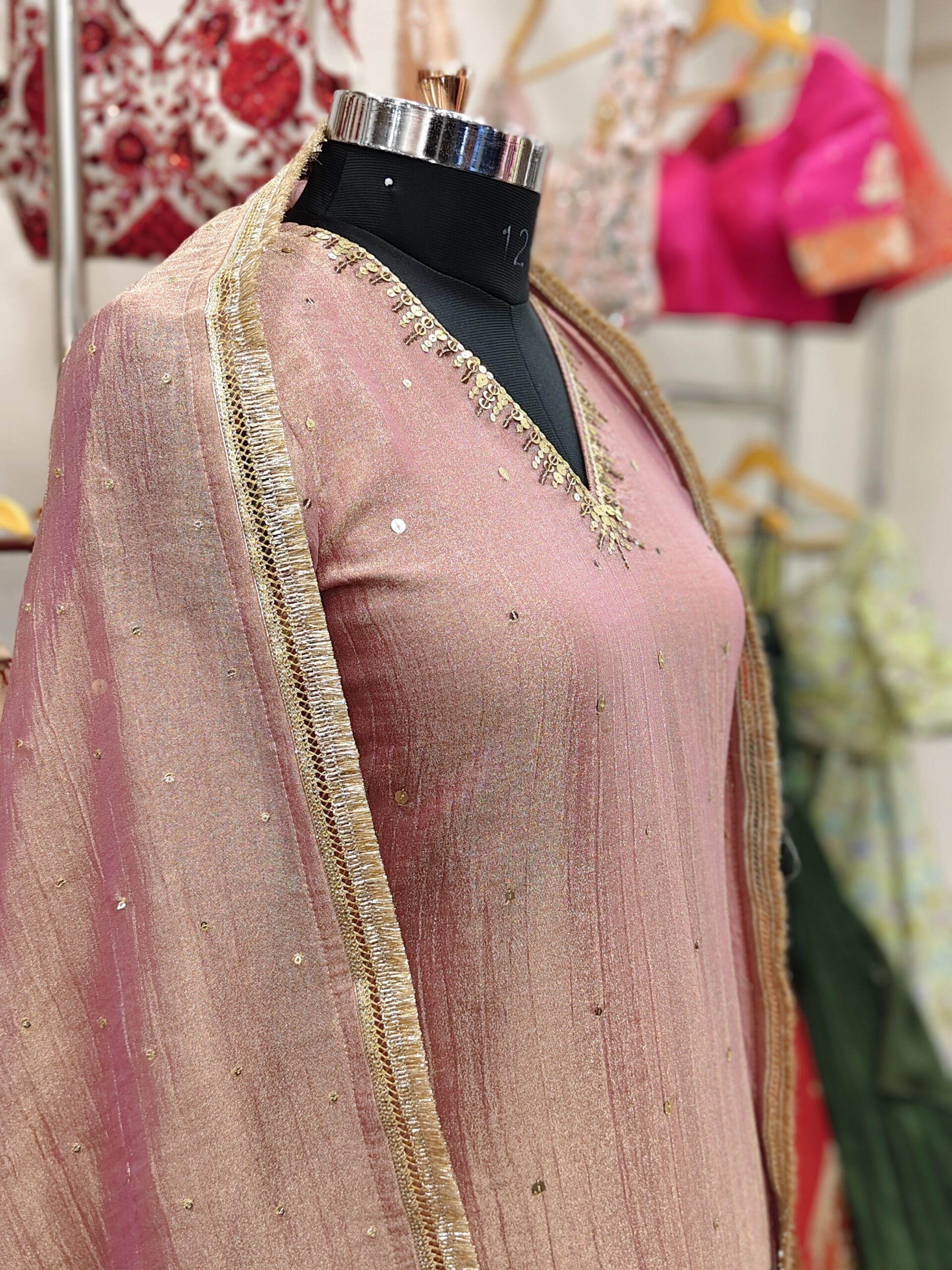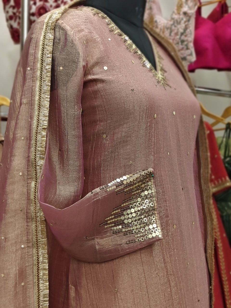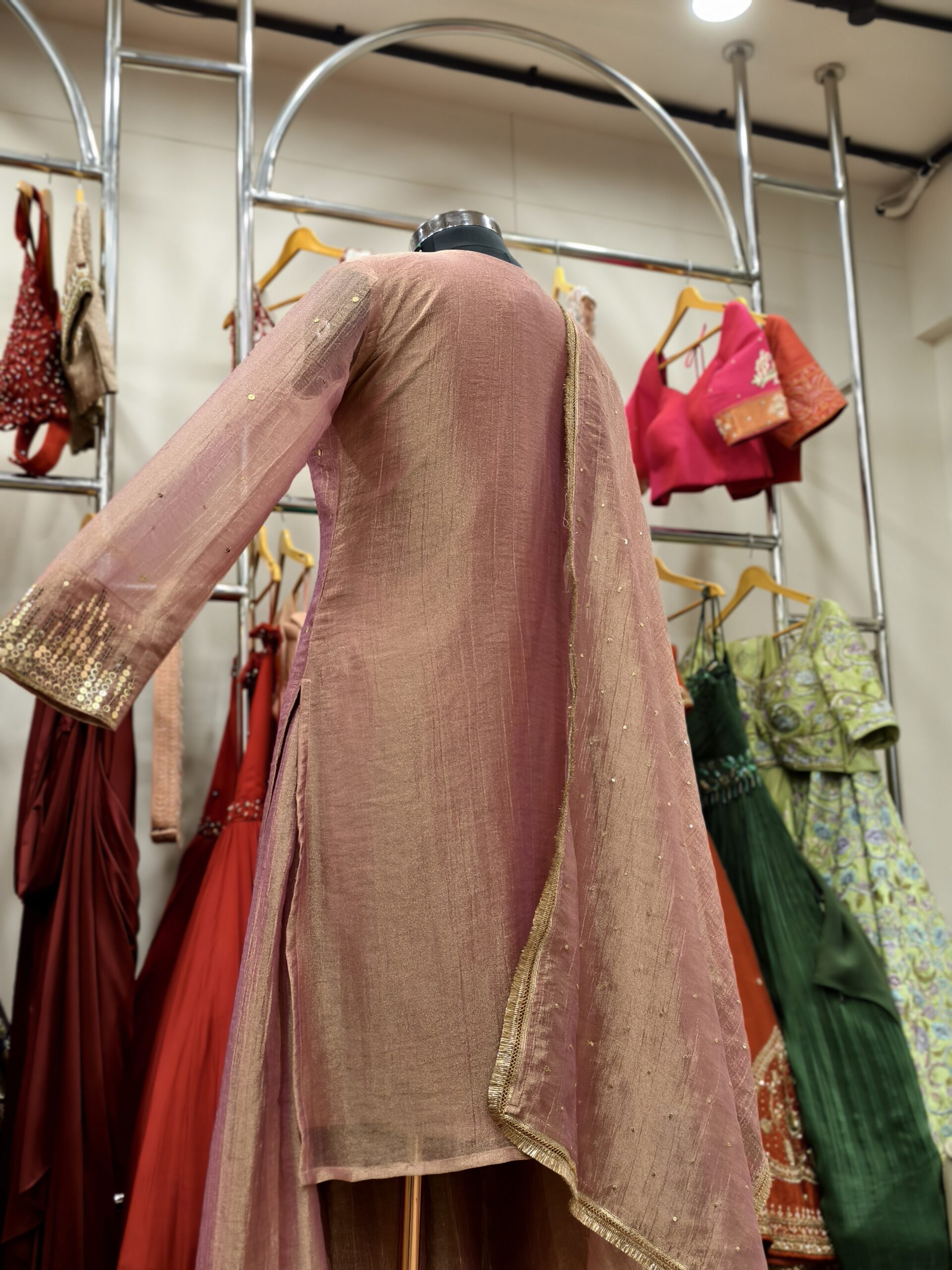 Step into understated glamour with this Rose Gold Tissue Kurta Plazo Set, designed to give you an effortlessly radiant festive look. The kurta features a subtle shimmer texture enhanced with delicate handwork along the V-neckline and soft sequin highlights scattered across the fabric, adding just the right touch of festive sparkle.